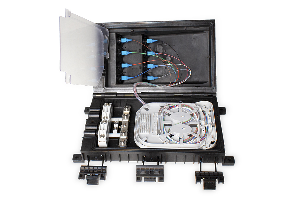 Cierre de Empalme QuickNap de 8 Acopladores SC Sx y PLC splitter 1x8 SCU grado IP67 Clamp-Block para 24 empalmes (incluye charolas)