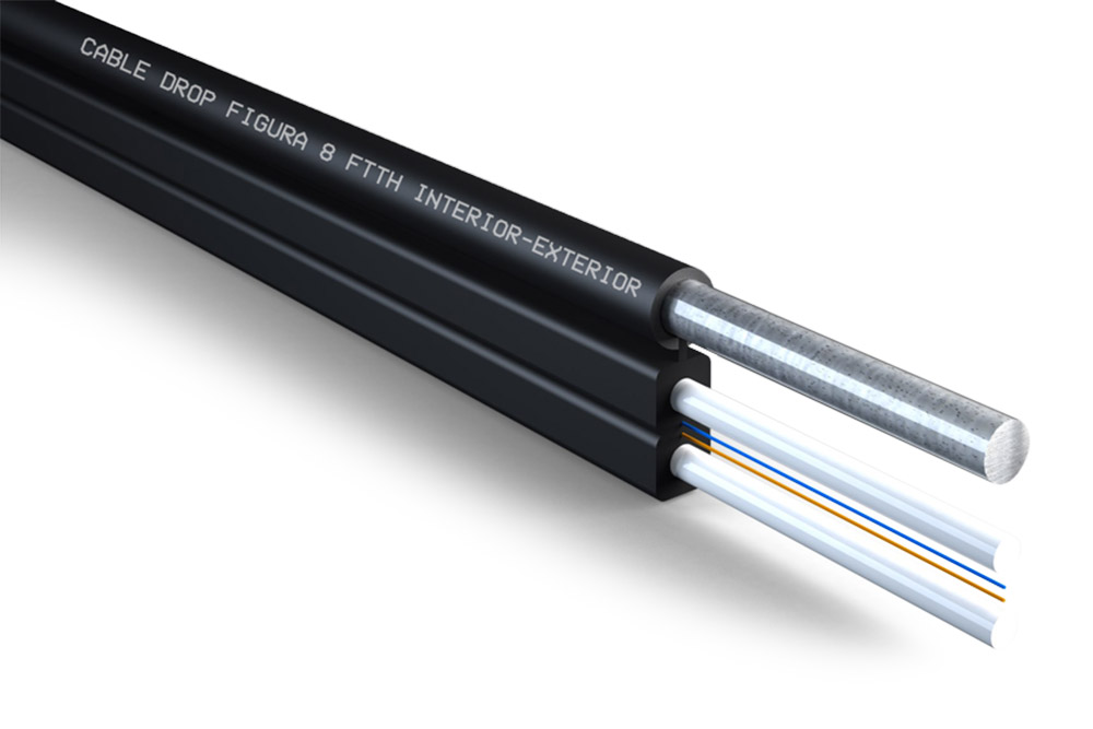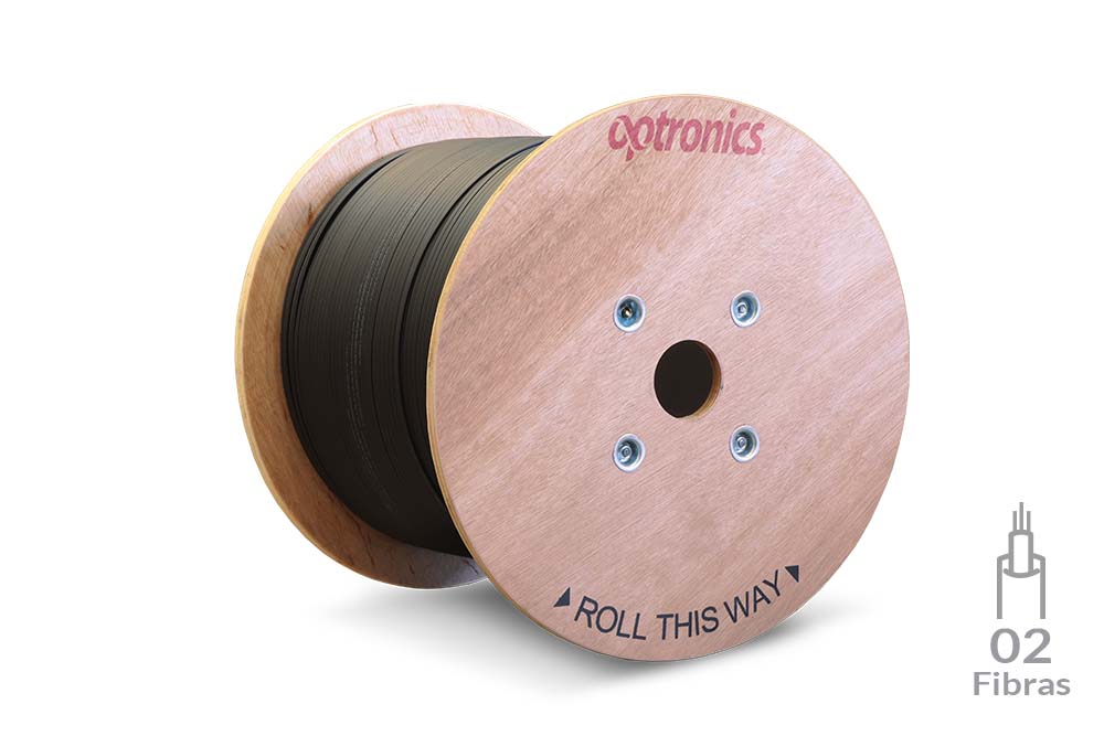 Carrete de 2 Km Cable de Fibra Óptica  Int-Ext DROP PLANO Fig. 8 con mensajero de acero Monomodo 9/125 G.657.A2 de 2 hilos Cero Halogeno